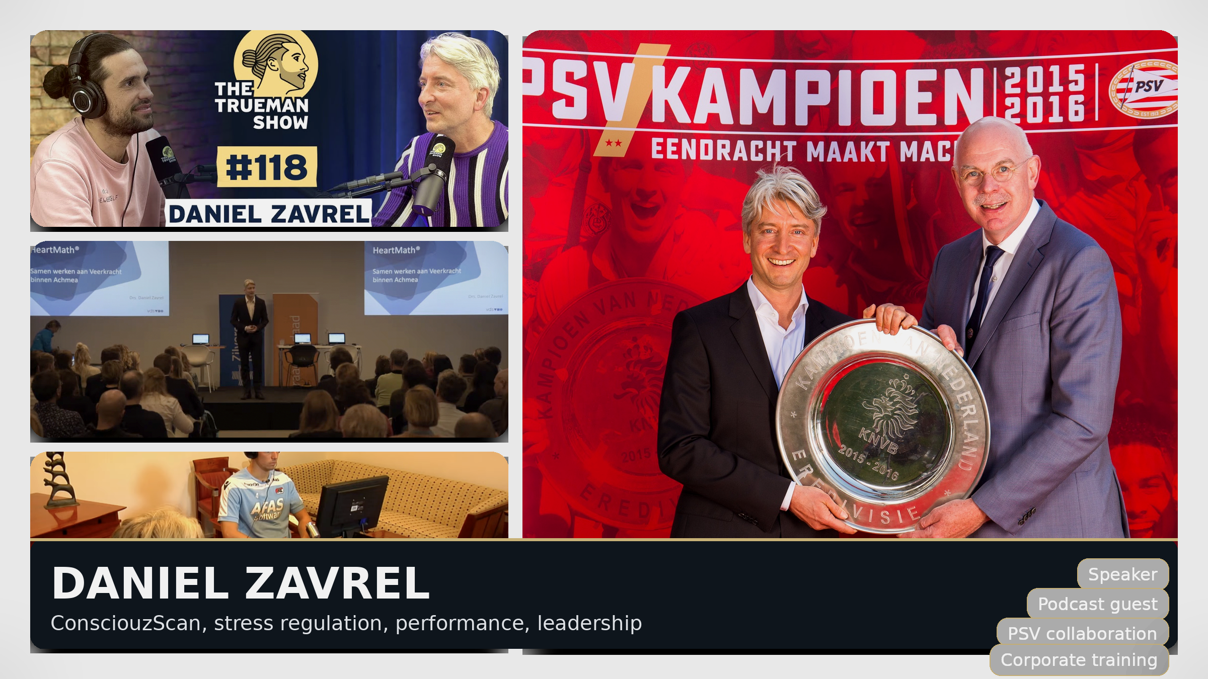 His work has been applied within organizations such as Accenture, PwC, Philips, Shell, Microsoft, and The Dutch Police, and in elite football at PSV (where ConsciouzSan contributed to three Dutch national championships) and AZ (where ConsciouzScan contributed to winning the Dutch KNVB Cup).